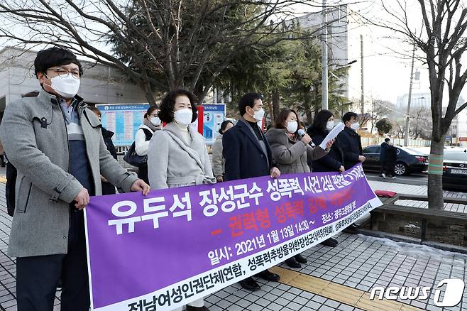 (광주=뉴스1) 허단비 기자 = 강제추행 혐의로 재판에 넘겨진 유두석 장성군수의 2심 판결이 있던 13일 오후 광주고등법원 앞에서 전남 여성단체가 재판부의 무죄 판결을 규탄하고 있다. 여성단체는 '증거 불충분이 성폭력 사건을 무죄로 만들지는 않는다'며 '유 군수의 무죄 판결은 엄연한 2차 가해'라며 재판부를 비판했다. 2021.1.13/뉴스1