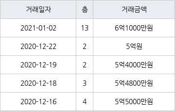 [이 기사는 조선비즈와 아티웰스가 공동으로 개발해 서비스하는 로봇 기사입니다.]국토교통부 실거래가 공개시스템에 따르면 지난 2021년 1월 2일 경기도 용인시 수지구 풍덕천동 초입마을삼익풍림동아 13층 전용면적 59㎡형이 6억1000만원에 거래됐다.