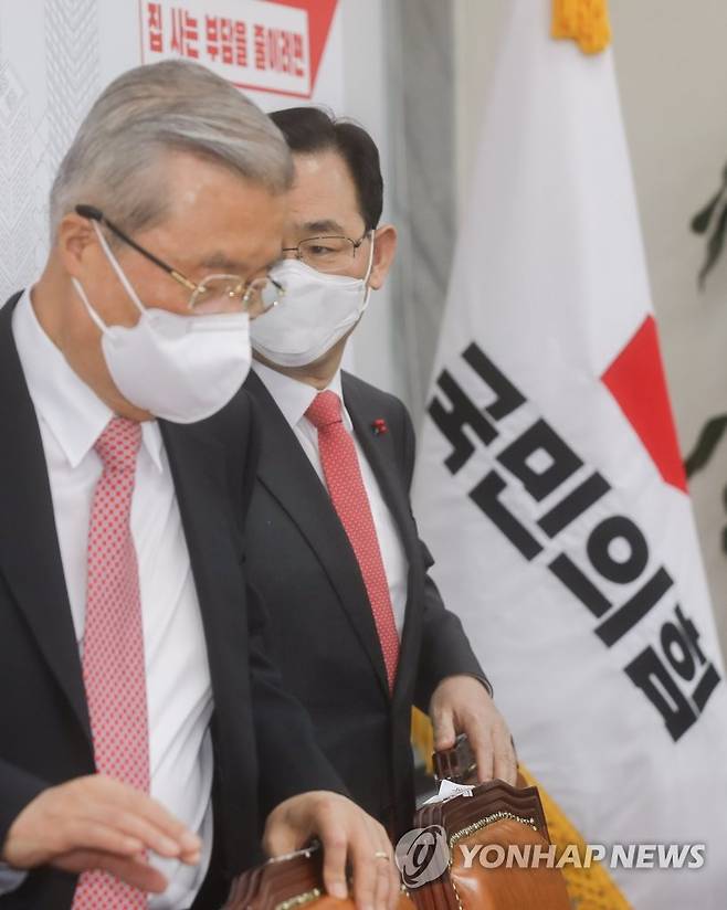 (서울=연합뉴스) 진성철 기자 = 국민의힘 김종인 비상대책위원장과 주호영 원내대표가 13일 국회에서 열린 부동산 정상화 대책 기자회견에 입장하고 있다. 2021.1.13