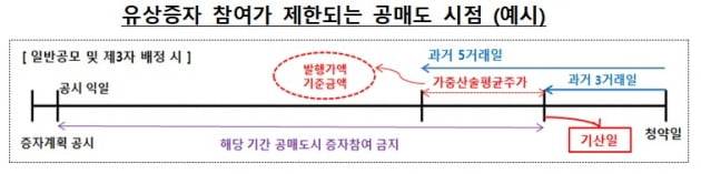 이에 금융위는 유상증자 계획이 공시된 다음날부터 신주 발행가 확정을 위한 거래기간의 마지막날(발행가 산정 기산일) 사이에 공매도를 한 투자자는 증자 참여를 통해 신주를 받을 수 없도록 했다. 해당 기간은 평균 70일 정도다.