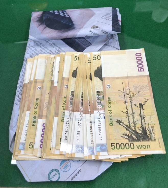 (서울=연합뉴스) 신안군이 지난 12일 전남 신안군 '무한의 다리'를 찾아온 한 관광객이 압해읍 신안군청을 찾아 신문지로 꽁꽁 싸맨 200만 원을 전달한 뒤 사라졌다고 13일 전했다. 사진은 익명의 기부자가 내민 200만 원. 2021.1.13