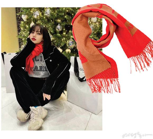 다소 둔탁해지는 윈터 룩에 생기를 불어넣기 위한 핵심 스킬은 단연 컬러 매칭에 있다. 그렇다고 지나치게 가볍거나 화려한 컬러 조합은 촌스러워 보일 위험이 있으니 주의할 것. 보는 것만으로도 눈이 시린 쨍한 컬러 머플러를 선택했다면, 머플러에 우유를 한 방울 톡 떨어트린 듯한 비슷한 계열의 파스텔 컬러 톱을 추천한다. 다양한 컬러 매칭이 부담스럽다면 블랙핑크의 리사처럼 어디에나 잘 어울리는 블랙 룩을 매치해 시선을 머플러에만 집중시키는 것도 좋은 방법이다. 리사가 입은 블랙 트레이닝 룩이 이토록 세련돼 보이는 이유는 소재와 디테일에 있다. 고급스러운 벨벳 소재에 화이트 라이닝으로 포인트를 준 아이템으로 꾸안꾸 스타일을 완성했기 때문. 그녀가 선택한 루이비통의 머플러는 LV 이니셜을 커다란 크기로 담아 클래식한 하우스 모티프를 색다르게 해석한 아이템. 레드와 베이지의 컬러 조합과 퓨어 캐시미어의 부드럽고 고급스러운 촉감 또한 포인트다. 가격미정 루이비통.
