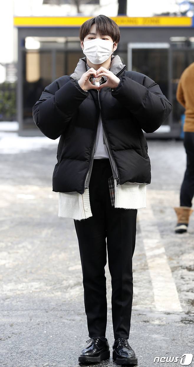 (서울=뉴스1) 권현진 기자 = 가수 하성운이 13일 서울 영등포구 여의도 KBS에서 열리는 KBS 2TV '트롯 전국체전' 촬영 차 방송국으로 들어서며 하트를 그리고 있다. 2021.1.13/뉴스1