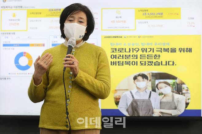 [이데일리 노진환 기자] 박영선 중소벤처기업부 장관이 13일 오후 서울 마포구 소상공인시장진흥공단 서울강원지역본부에서 '소상공인 버팀목자금' 집행상황을 보고 받은 뒤 취재진의 질문에 답변하고 있다.