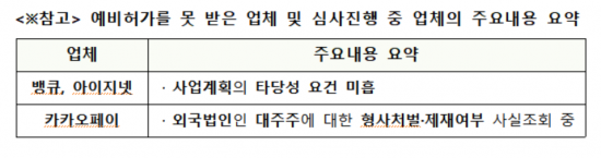3개 기업 가운데 뱅큐와 아이지넷 등 2개사는 외부평가위원회 심사결과 등에 따른 허가요건 미흡으로 이번에도 예비허가를 받지 못했다.