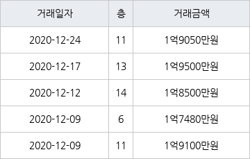 지난 2020년 12월 24일 같은 면적형인 11층 물건이 1억9050만원에 실거래된 것과 비교해 같은 가격이다.