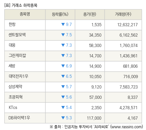 [fnRASSI]장마감, 거래소 하락 종목(한창 -9.7% ↓)