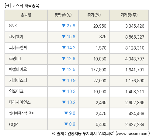 [fnRASSI]장마감, 코스닥 하락 종목(SNK -27.8% ↓)