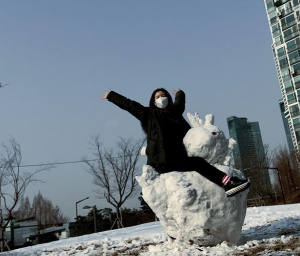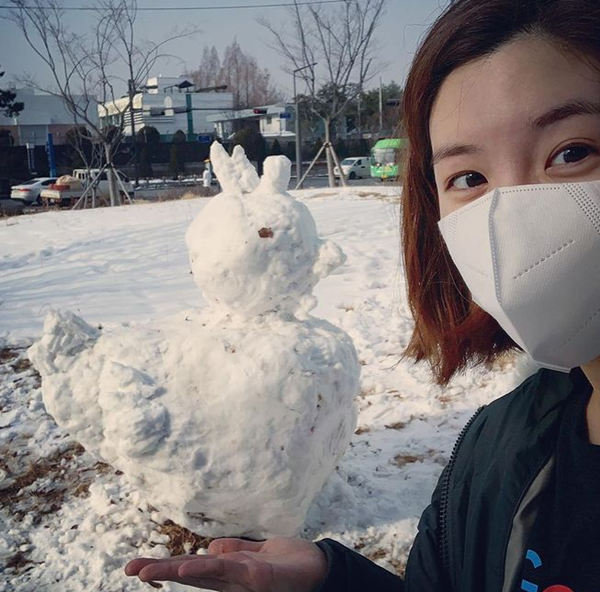 공개된 사진 속 함연지는 눈밭에서 직접 만든 초대형 눈닭과 함께 포즈를 취했다.