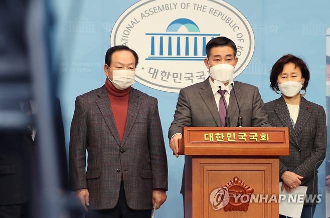 (서울=연합뉴스) 진성철 기자 = 국회 국방위원회 소속 국민의힘 신원식, 한기호 의원 등이 13일 국회 소통관에서 대북 안보·국방 정책의 근본적인 전환을 촉구하고 있다. 2021.1.13
