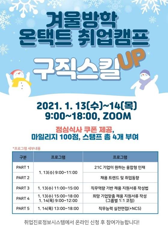 삼육대(총장 김일목) 대학일자리본부는 겨울방학을 맞아 재학생들의 ‘구직스킬’을 강화하기 위한 ‘온택트 취업캠프’를 13~14일 양일간 개최한다.