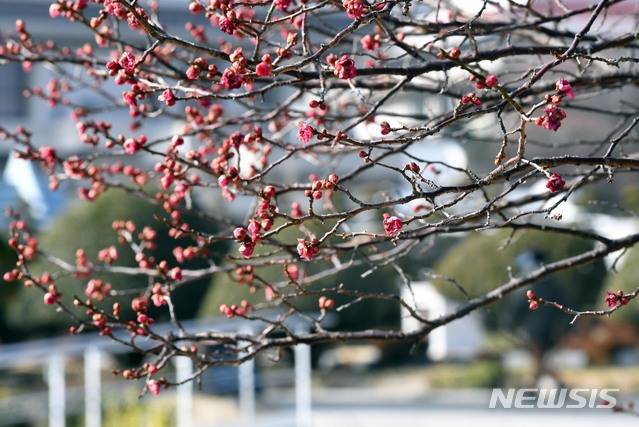 [부산=뉴시스] 하경민 기자 = 역대급 북극발 한파가 물러난 13일 부산 남구 유엔기념공원에 홍매화가 꽃망울을 터뜨리고 있다. 이날 부산지역 낮 최고기온은 평년 보다 4도 가량 높은 11.7도를 기록했으며, 평년 보다 높은 기온분포는 오는 15일까지 이어질 것으로 부산기상청은 예보했다. 2021.01.13. yulnetphoto@newsis.com