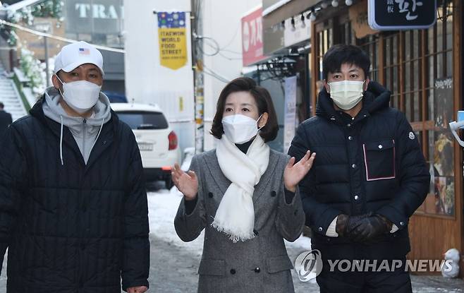 (서울=연합뉴스) 국민의힘 나경원 전 의원이 13일 서울 용산구 이태원동 먹자골목 인근에서 서울시장 보궐선거 출마 선언에 앞서 신종 코로나바이러스 감염증(코로나19) 사태로 어려움을 겪고 있는 청년 상인들과 대화하고 있다. 2021.1.13 [국회 사진기자단]