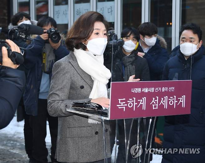 (서울=연합뉴스) 국민의힘 나경원 전 의원이 13일 서울 용산구 이태원동 먹자골목 인근에서 서울시장 보궐선거 출마를 선언하고 있다. 2021.1.13 [국회 사진기자단]