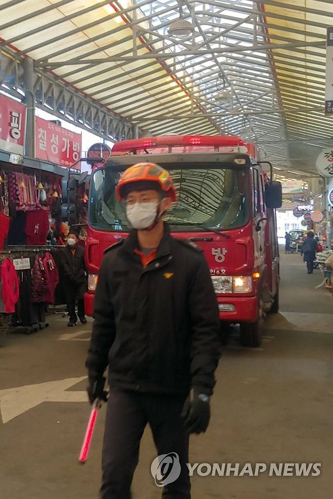 (광주=연합뉴스) 13일 오후 광주 동구 남광주시장에서 소방차 출동로 확보를 위한 길 터주기 훈련이 열리고 있다. 광주 동부소방서는 소방차 진입 곤란 지역, 주요 정체 도로에서 긴급자동차 양보 의무와 우선 통행 요령을 알리기 위해 훈련을 했다. 2021.1.13 [광주 동부소방서 제공. 재판매 및 DB 금지]