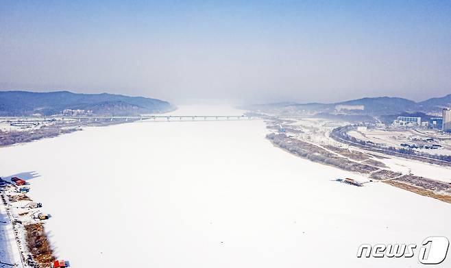 (여주=뉴스1) = 13일 오전 경기도 여주시내 남한강이 한파로 얼어붙은 채 전날 내린 눈이 덮여 하얗게 보이고 있다. (여주시 제공) 2021.1.13/뉴스1
