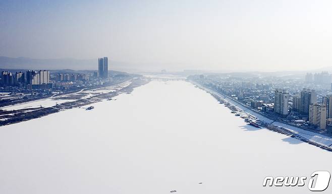 (여주=뉴스1) = 13일 오전 경기도 여주시내 남한강이 한파로 얼어붙은 채 전날 내린 눈이 덮여 하얗게 보이고 있다. (여주시 제공) 2021.1.13/뉴스1