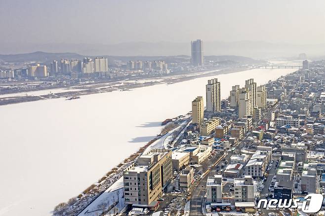 (여주=뉴스1) = 13일 오전 경기도 여주시내 남한강이 한파로 얼어붙은 채 전날 내린 눈이 덮여 하얗게 보이고 있다. (여주시 제공) 2021.1.13/뉴스1