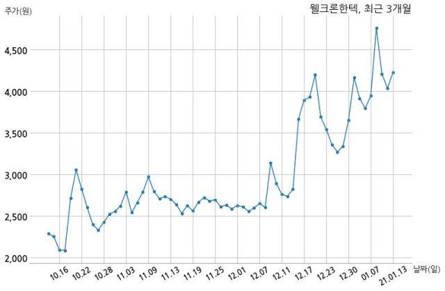 한편, 웰크론한텍은 장 마감 이후 해당 기업공시를 발표했으며 오늘 종가가 4,230원, 거래량은 5,833,387주로, 직전 거래일 대비 195원(+4.83%) 상승했다.