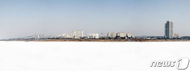 (여주=뉴스1) = 13일 오전 경기도 여주시내 남한강이 한파로 얼어붙은 채 전날 내린 눈이 덮여 하얗게 보이고 있다. (여주시 제공) 2021.1.13/뉴스1