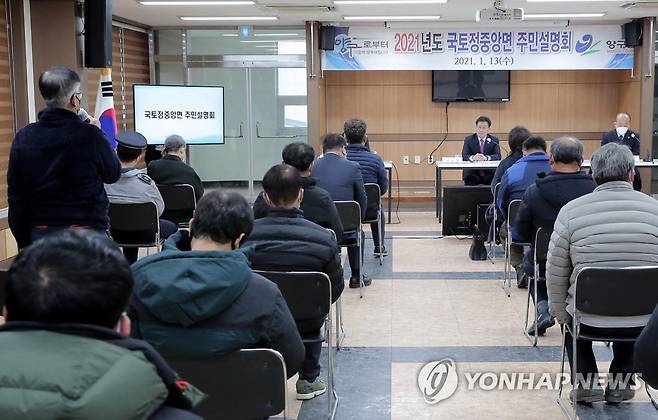 (양구=연합뉴스) 13일 강원 양구군 국토정중앙면 복지회관에서 열린 주민설명회에서 조인묵 군수가 새해 군정과 관련한 주민 질문을 듣고 있다. 2021.1.13 [양구군 제공. 재판매 및 DB 금지]