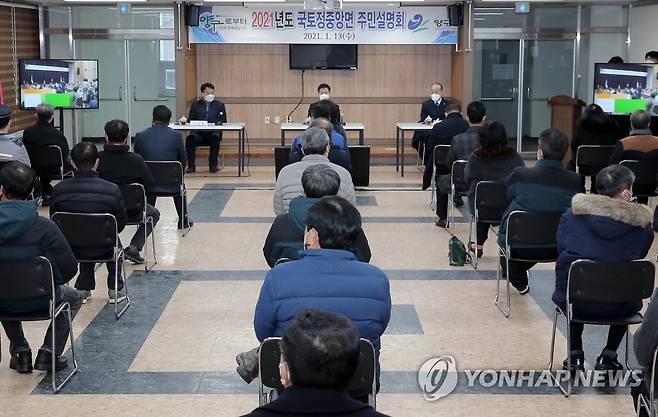 (양구=연합뉴스) 13일 강원 양구군 국토정중앙면 복지회관에서 열린 주민설명회에서 조인묵 군수가 군정 중점 시책을 설명하고 있다. 2021.1.13 [양구군 제공. 재판매 및 DB 금지]