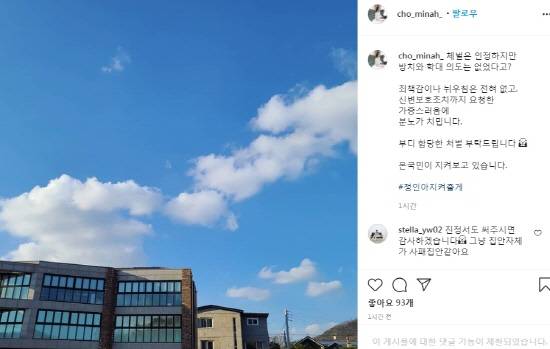 조민아는 13일 인스타그램에 "죄책감이나 뉘우침은 전혀 없고 신변보호조치까지 요청한 가증스러움에 분노가 치밉니다"라는 글을 올렸다.