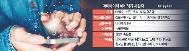 금융위원회는 지난해 12월 22일 21개 회사에 마이데이터 예비허가를 내줬다. 은행 중에는 KB국민·신한·우리·NH농협은행 등 4개사, 여신전문금융사 중에는 신한·KB국민·현대·우리·BC카드, 현대캐피탈 등 6개사가 허가를 받았다. 금융투자사는 미래에셋대우가, 상호금융은 농협중앙회가, 저축은행은 웰컴저축은행이 예비허가를 받게 됐다. 핀테크 중에는 네이버파이낸셜·레이니스트·보맵·핀다·팀윙크·한국금융솔루션·한국신용데이터·NHN페이코가 획득했다.