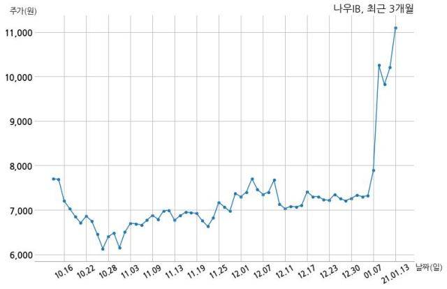 한편, 나우IB은 장 마감 이후 해당 기업공시를 발표했으며 오늘 종가가 11,100원, 거래량은 5,779,581주로, 직전 거래일 대비 900원(+8.82%) 상승했다.