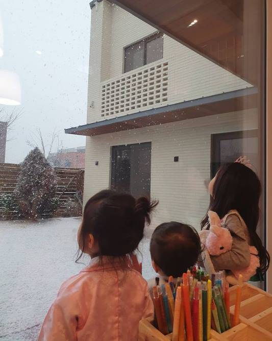 공개된 사진 속에는 집 통창에 꼭 붙어 서있는 삼남매의 모습이 담겼다. 창밖으로 내리는 눈을 구경하고 있는 것. 사랑스러운 아이들의 모습이 미소를 안긴다.
