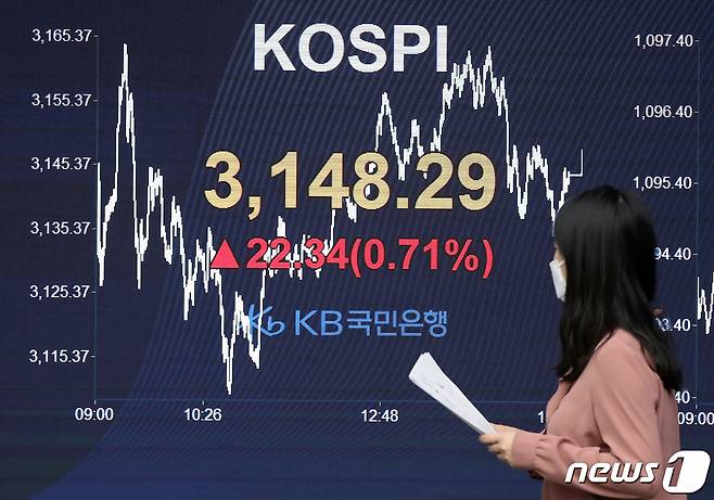 (서울=뉴스1) 박세연 기자 = 13일 서울 영등포구 KB국민은행 여의도지점 스마트딜링룸 전광판에 코스피지수가 전일대비 22.34포인트 오른 3,148.29를 나타내고 있다. 이날 코스피는 외국인이 오후 들어 순매수로 전환하고 개인도 지속 순매수하면서 3일만에 반등했다. 2021.1.11/뉴스1