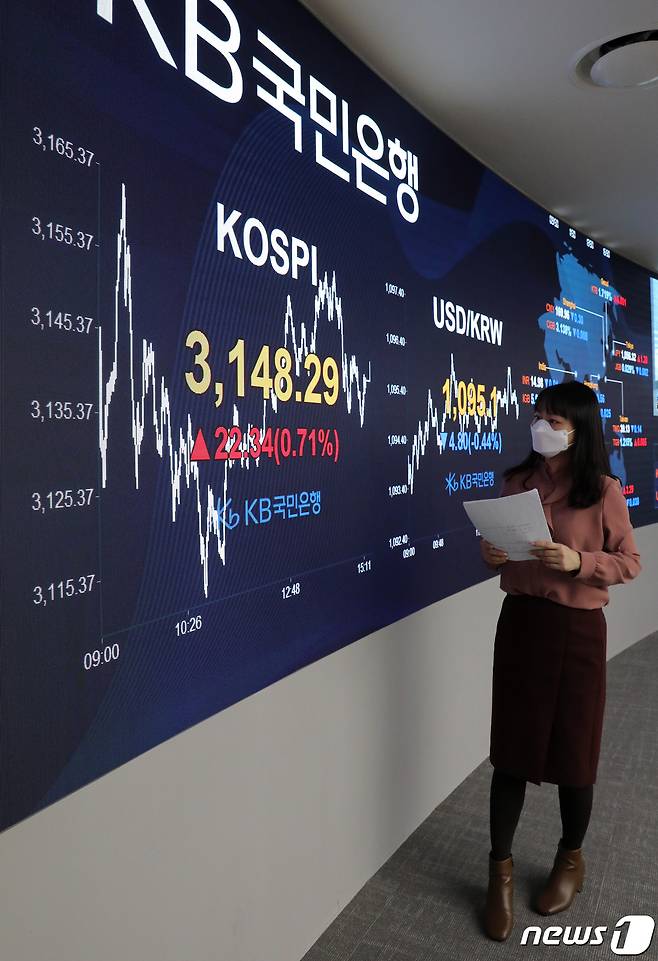 (서울=뉴스1) 박세연 기자 = 13일 서울 영등포구 KB국민은행 여의도지점 스마트딜링룸 전광판에 코스피지수가 전일대비 22.34포인트 오른 3,148.29를 나타내고 있다. 이날 코스피는 외국인이 오후 들어 순매수로 전환하고 개인도 지속 순매수하면서 3일만에 반등했다. 2021.1.11/뉴스1