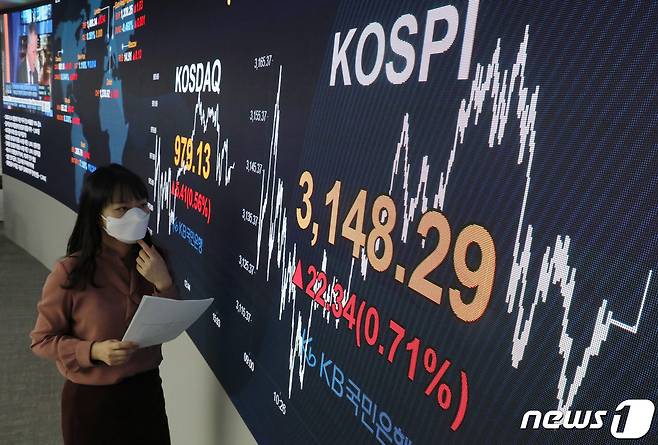 (서울=뉴스1) 박세연 기자 = 13일 서울 영등포구 KB국민은행 여의도지점 스마트딜링룸 전광판에 코스피지수가 전일대비 22.34포인트 오른 3,148.29를 나타내고 있다. 이날 코스피는 외국인이 오후 들어 순매수로 전환하고 개인도 지속 순매수하면서 3일만에 반등했다. 2021.1.11/뉴스1