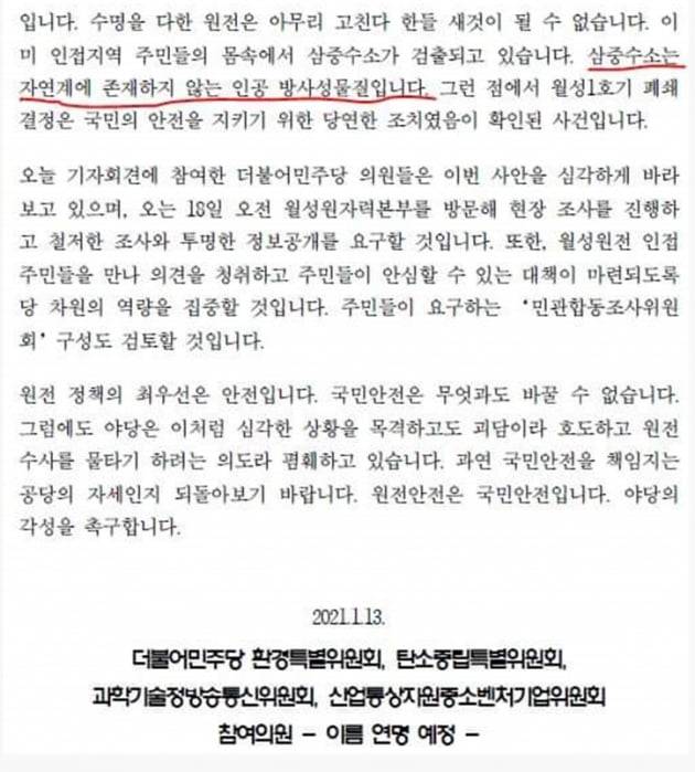 자료에는 "수명을 다한 원전은 아무리 고친다 한들 새것이 될 수 없다. 이미 인접지역 주민들의 몸 속에서 삼중수소가 검출되고 있다. 삼중수소는 자연계에 존재하지 않는 인공 방사성물질이다"라는 내용이 담겼다.