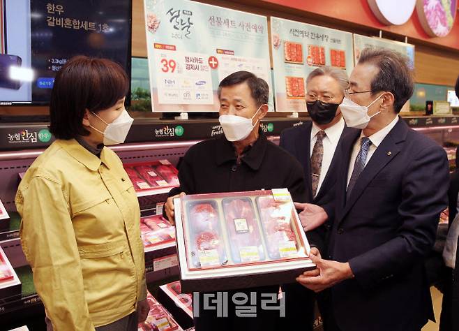 [이데일리 김태형 기자] 전현희 국민권익위원장(왼쪽 첫번째)과 이성희(네번째) 농협중앙회장, 정연태(두번째) 농협유통 대표 등이 13일 오후 서울 서초구 농협하나로마트 양재점에서 설 선물세트 등을 살펴보고 있다.
