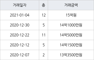 국토교통부 실거래가 공개시스템에 따르면 지난 2021년 1월 4일 서울특별시 강남구 개포동 SH공사대치1단지 12층 전용면적 49㎡형이 15억원에 거래됐다. 지난 2021년 1월 4일 같은 면적형인 12층 물건이 15억원에 실거래된 것과 비교해 같은 가격이다.