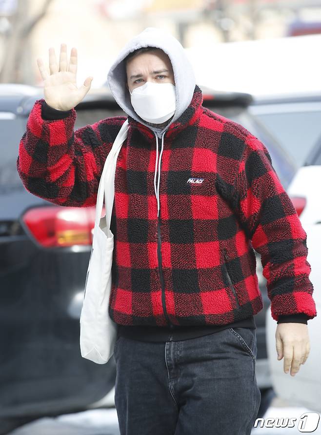 (서울=뉴스1) 권현진 기자 = 방송인 샘 해밍턴이 13일 서울 영등포구 여의도 KBS에서 열리는 KBS 2TV '트롯 전국체전' 촬영 차 방송국으로 들어서며 인사를 하고 있다. 2021.1.13/뉴스1