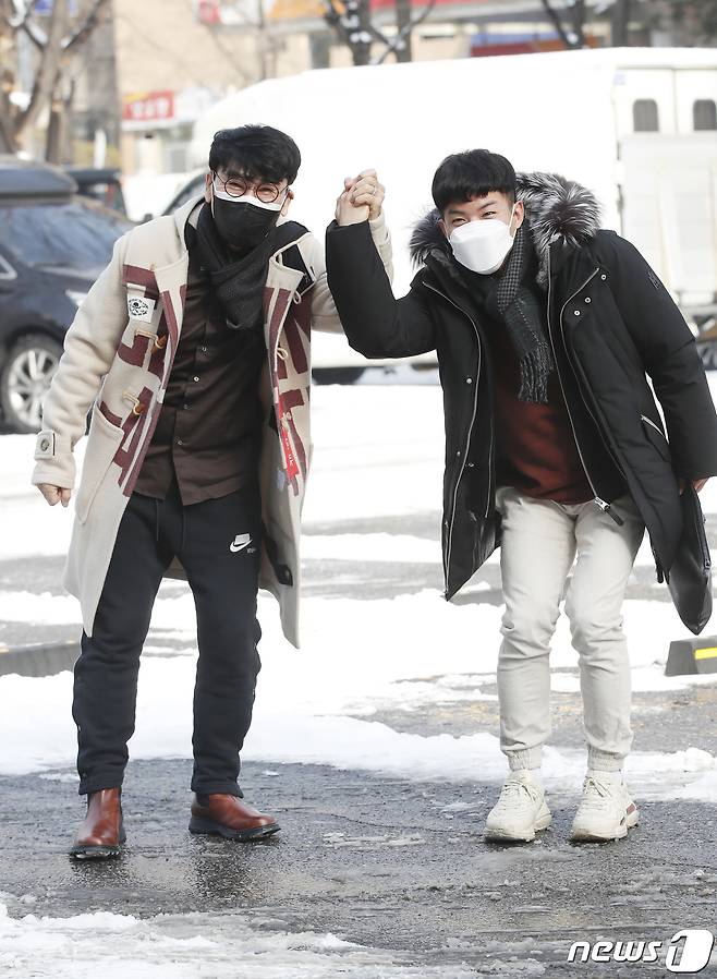 (서울=뉴스1) 권현진 기자 = 가수 조항조, 나태주(오른쪽)가 13일 서울 영등포구 여의도 KBS에서 열리는 KBS 2TV '트롯 전국체전' 촬영 차 방송국으로 들어서며 인사를 하고 있다. 2021.1.13/뉴스1