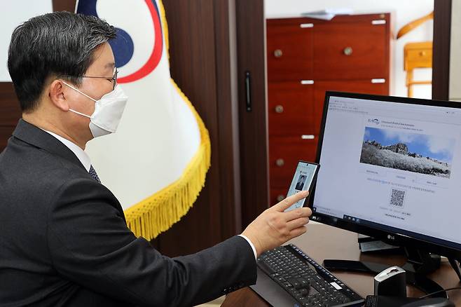 모바일 공무원증이 이달부터 도입된다. 스마트폰에서 애플리케이션(앱)으로 발급받아 필요할 때 신분 증명용, 청사 출입 등에 사용할 수 있다. 14일부터 행정안전부와 인사혁신처 공무원을 대상으로 공식 운영에 들어간다. 전해철 행정안전부 장관이 13일 오전 정부세종2청사 집무실에서 모바일 공무원증으로 행정안전부 업무시스템에 로그인을 시연해 보고 있다.