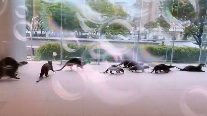 싱가포르 도심에서 수달 10여 마리가 떼를 지어 행진하는 동영상이 화제입니다.
