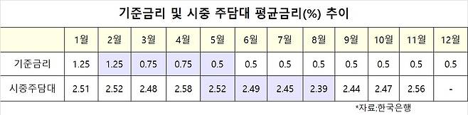 지난해 기준금리는 1.25%에서 0.5%까지 떨어졌지만, 주택 매수자들에 실제 영향을 미치는 주담대 금리 변화는 미미했다. 오히려 집값이 본격적으로 뛴 9월 이후엔 오히려 주담대 금리가 올라가는 추세다.