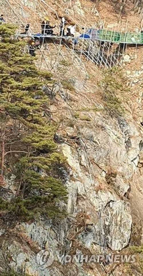 (원주=연합뉴스) 13일 오후 1시 30분께 강원 원주시 지정면 판대리 소금산에서 숲길 조성 공사를 하던 A씨가 30여m 절벽 아래로 떨어져 119대원들이 구조 활동을 벌이고 있다. 2021.1.13 [원주소방서 제공. 재판매 및 DB 금지]