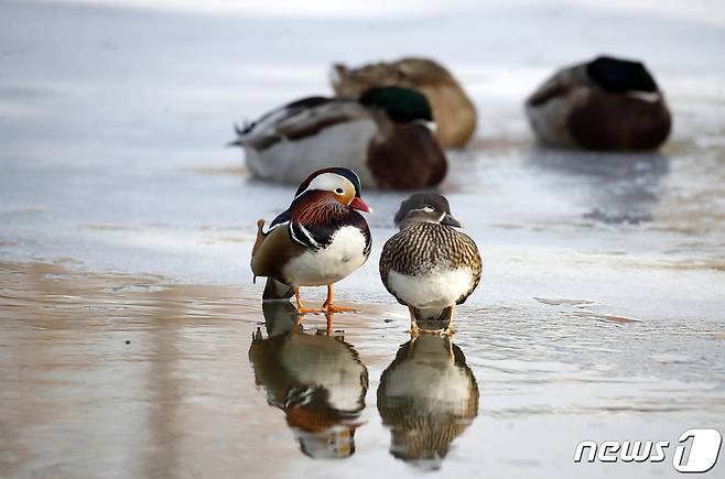 (광주=뉴스1) 허단비 기자 = 한파가 물러가고 포근한 날씨를 회복한 13일 광주 북구 전남대학교 용지에 오리들이 얼음 위에 서있다.(광주북구 제공)2021.1.13/뉴스1