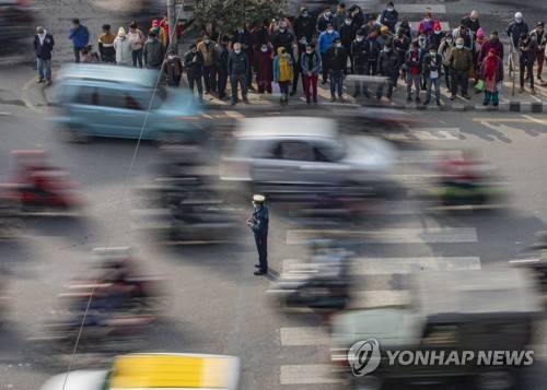 epa08934292 A picture made with a slow shutter speed technique shows a traffic police officer standing while pedestrians wait for signal to cross the road in Kathmandu, Nepal, 13 January 2021. EPA/NARENDRA SHRESTHA