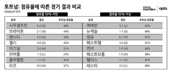 아래 도표에서도 확인할 수 있다시피 이번 시즌 토트넘이 50% 미만의 점유율을 기록했을 때 패한 경기는 리버풀 원정이 유일하다. 반면 점유율이 50% 이상인 경기에서는 오히려 득점이 줄어들고 실점이 늘어나는 현상이 발생하고 있다.
