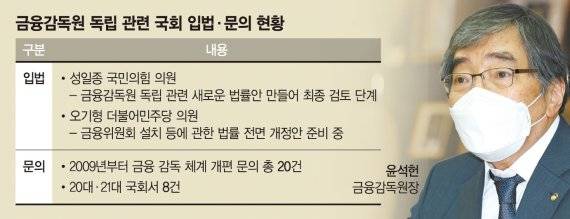 금감원 독립을 오랜 소신으로 견지해온 윤 원장은 당초 '금감원 독립방안'을 국회에 제출하겠다고 했지만, 아직 제출하지는 않은 것으로 확인됐다. 금감원 독립방안은 입법에 필요한 것은 아니지만, 윤 원장의 의사를 공개적으로 나타내는 '강한 의지의 표현'이라는 상징적 의미를 가진다는 전언이다.