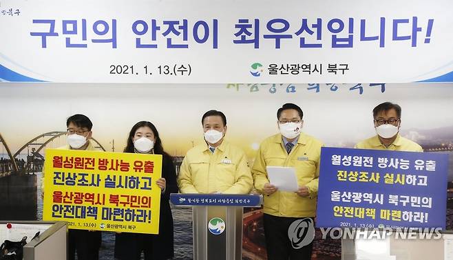 (울산=연합뉴스) 13일 오후 울산시 북구청 프레스센터에서 이동권 북구청장(가운데), 임채오 북구의회 의장(오른쪽 두 번째), 탈핵울산시민공동행동이 기자회견을 열고 있다. 이들은 한국수력원자력과 원자력안전위원회에 경주 월성원전 삼중수소 유출에 대한 철저한 진상 조사 등을 촉구했다. 2021.1.13 [울산시 북구 제공. 재판매 및 DB 금지]