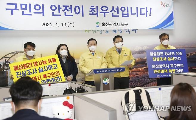 (울산=연합뉴스) 13일 오후 울산시 북구청 프레스센터에서 이동권 북구청장(가운데), 임채오 북구의회 의장(오른쪽 두 번째), 탈핵울산시민공동행동이 기자회견을 열고 있다. 이들은 한국수력원자력과 원자력안전위원회에 경주 월성원전 삼중수소 유출에 대한 철저한 진상 조사 등을 촉구했다. 2021.1.13 [울산시 북구 제공. 재판매 및 DB 금지]