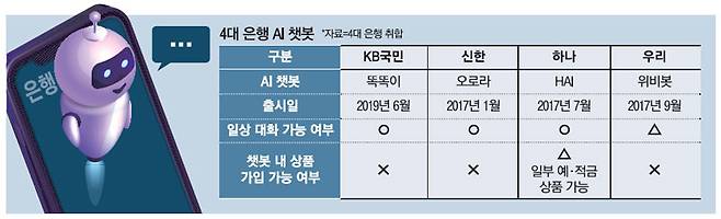 4대 시중은행은 각각 똑똑이(KB국민은행), 오로라(신한은행), HAI(하나은행), 위비봇(우리은행)이라는 AI 챗봇 서비스를 운영 중이다.