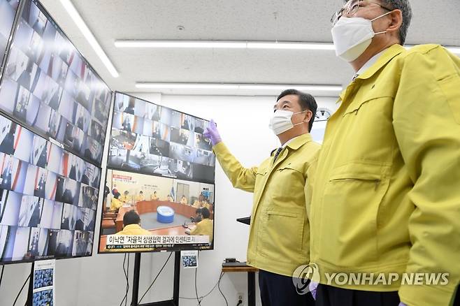 (서울=연합뉴스) 서정협 서울시장 권한대행이 13일 서울 시립대 코로나19 생활치료센터를 방문해 서순탁 총장(오른쪽)과 함께 생활치료센터 시설을 둘러보고 있다. 2021.1.13